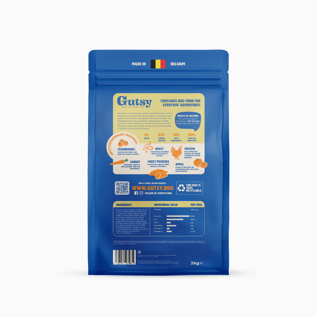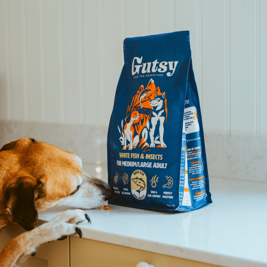 Gutsy Witte Vis & Insect voor grote volwassen honden zijn hypoallergene brokjes, volledig vrij van granen en gluten. Met liefde gemaakt voor gevoelige eters.
